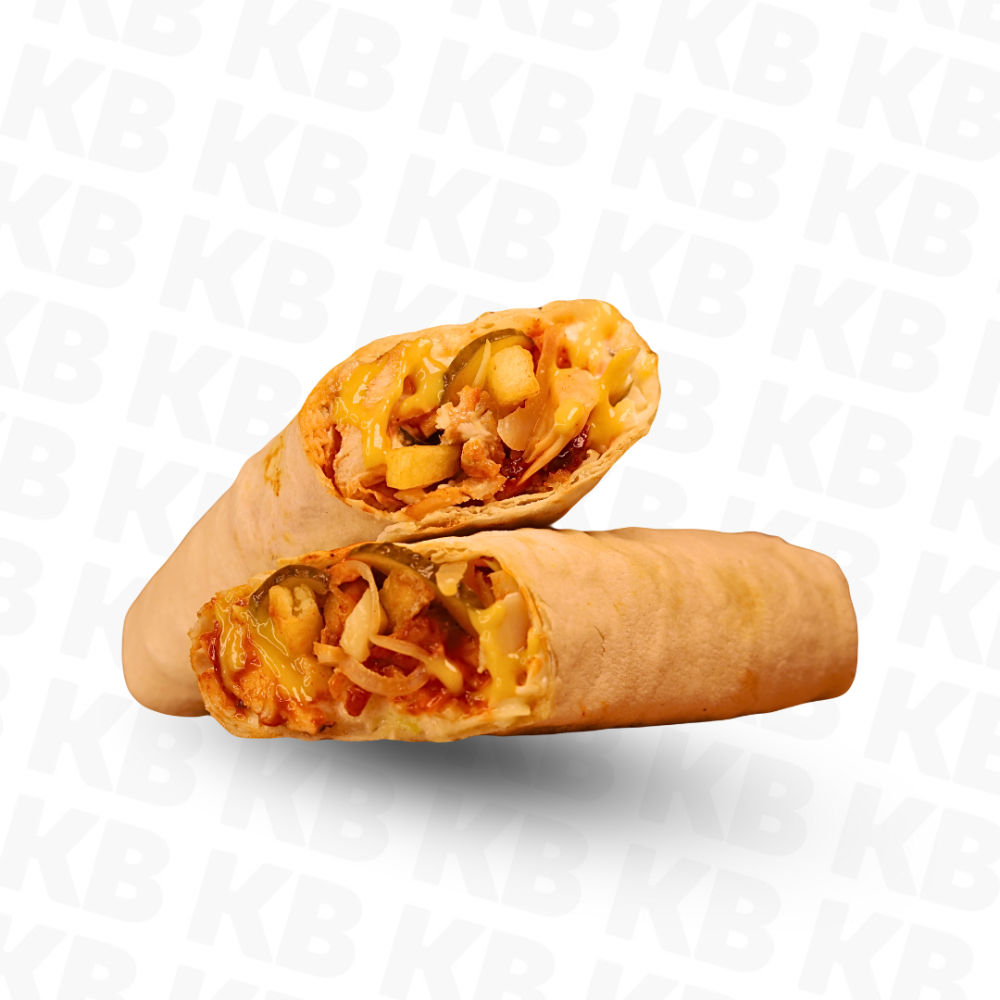 Лаваш, Мясо, Капуста с морковью, Соленый огурец, Картофель фри, Лук, Грибы шампиньоны, Фирменный соус, Горчичный соус, Кетчуп